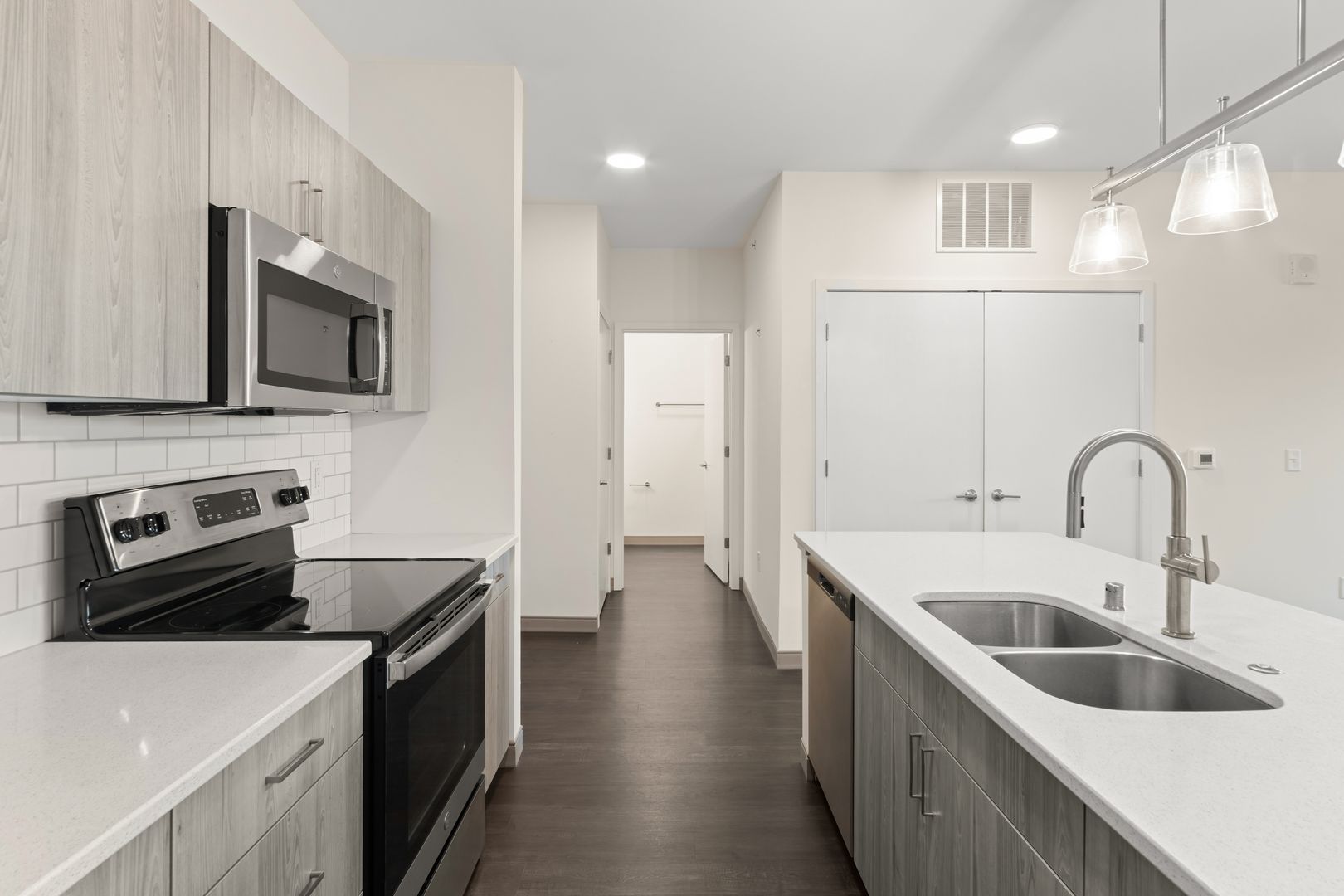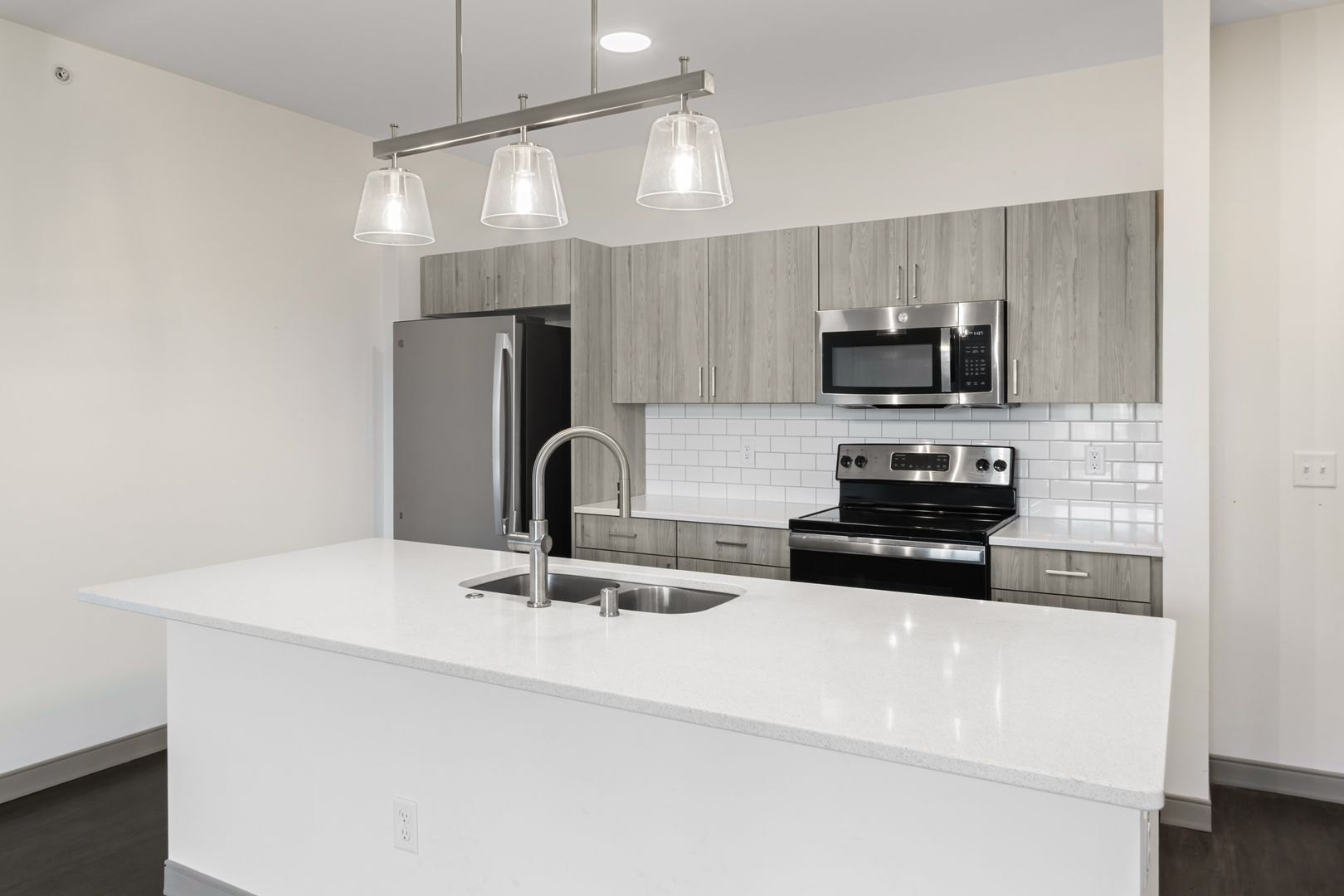 Each thoughtfully designed apartment features hard plank flooring, in-unit laundry, and forced heat and A/C for year-round comfort. Cook with ease in a modern kitchen complete with stainless steel appliances, a dishwasher, and microwave, with a spacious island featured in most units.
