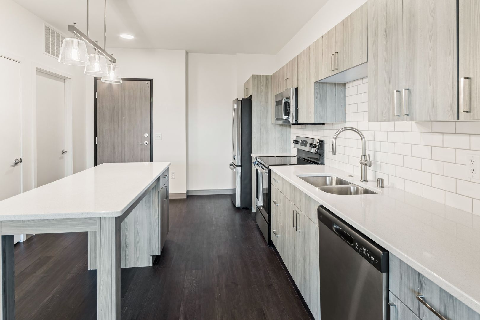 Each thoughtfully designed apartment features hard plank flooring, in-unit laundry, and forced heat and A/C for year-round comfort. Cook with ease in a modern kitchen complete with stainless steel appliances, a dishwasher, and microwave, with a spacious island featured in most units.